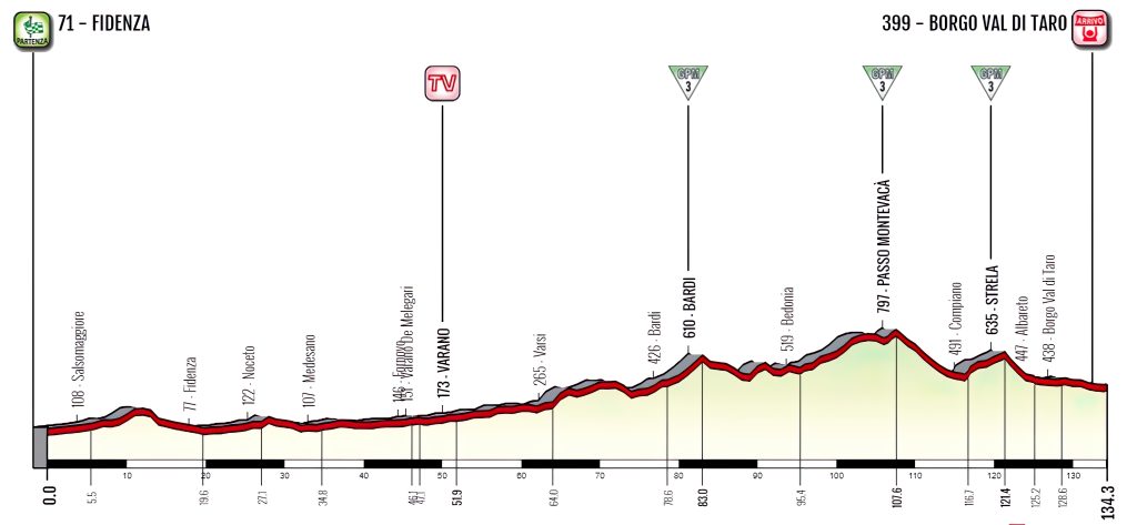 En in de finale wacht dan nog de klim naar Strela vanuit Compiano. Hierin moeten nog eens 200 hoogtemeters worden overwonnen. Maar dan wel in drie schuifjes, met twee stukken om weer even op adem te kunnen komen. Het hoogteverschil wordt dus wel degelijk overbrugd, maar het gaat allemaal niet zo heftig. Rustig aan dus, dat zijn ze in Borgo val di Taro ook wel gewend. Het stadje gaat er prat op dat het onderdeel is van de Slow City Movement. De kans is aanwezig dat enkele rensters hier om de zege willen sprinten. De vraag is even of dat vanuit een vlucht of een ietwat gereduceerd peloton gebeurt. Een advies willen we wel meegeven: niet te hard sprinten, het hoeft hier allemaal niet zo gehaast.
