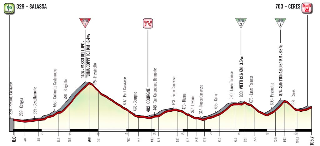 Een mooie rit voor het klassement, met het zwaartepunt in het eerste kwart van de rit. Vanuit Rivarolo Canavese (de Giro-karavaan is de Povlakte overgestoken tot even boven Turijn) krijgen de rensters na zo’n tien kilometer de eerste klim voor de kiezen. Vanuit het plaatsje Castellamonte is de Pian del Lupo 15,6 kilometer lang. Dat gaat aan een gemiddelde van 6,6%, maar daarbij moeten we in ogenschouw nemen dat de eerste kilometers niet heel moeilijk zijn. Nee, we krijgen pas een echt goed beeld van de beklimming als we vanaf Colleretto Castelnuovo de lucht in vliegen. 10,1 km à 8,4%, en zelfs een goede tweeënhalve kilometer boven de tien procent. Lekker hoor.