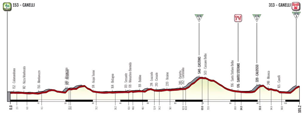 Er wordt met de klok mee zo’n honderd kilometer gereden, waarna er bij terugkomst in Canelli nog een finishklimmetje te wachten staat. Nergens is het overdreven lastig, maar het is een slechte etappe om een slechte dag te hebben. Op de Muro di Ricaldone (1,1 km à 9,7%), na goed 25 kilometer, hoeft dat nog niet desastreus te zijn, maar de langste klim van de dag kan dat wel zijn. De helling van Cortemilia naar Castino is goed voor 4,5 km klimmen aan een gemiddelde van 5,9%.