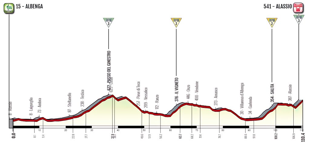 Op het gemakje afdalen zit er niet in, want het kronkelt eigenlijk continu. Het is dan ook een slechte etappe voor ploegleiders met wagenziekte. Net even langs de rivier is het wat rechter, maar lang duurt dat niet. Het tweede klimmetje van belang is die naar Costa Bacelega (4,9 km à 6,7%). Via weer een reeks kronkelwegen, die dorpjes en gehuchten met elkaar verbinden, komt de karavaan na 95 kilometer fietsen uiteindelijk uit in Garlenda. Daar begint de Paravenna (6,2 km à 6,3%), het eerste deel van de slotklim.