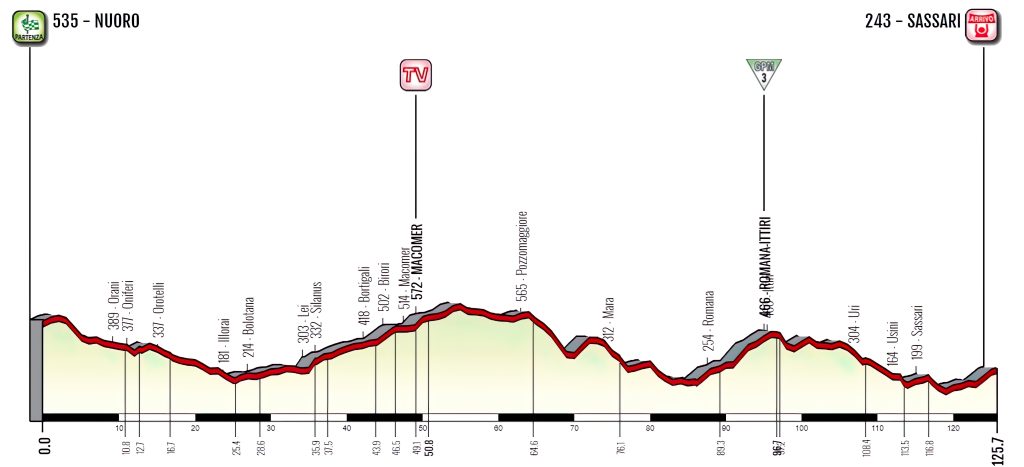Vanuit Nuoro (bijgenaamd: het Athene van Sardinië) gaat het eerst dik vijftig kilometer in oostelijke richting. Bij Macomer kan er koers worden gezet richting Sassari en voor die optie wordt dan ook gekozen. Een officieel klimmetje onderweg, maar voor iedereen met enige ambitie in de wielrennerij zou dat geen probleem moeten zijn. Alles lijkt dan ook te wijzen op een sprint in de finishplaats. Het loopt nog wel wat omhoog in de laatste kilometers, maar hier is zelfs met heel veel fantasie geen muur van te maken. Sprinten dus (een zware sprint, maar toch, een sprint), afvinken en door, of heeft de rit toch nog iets onverwachts in petto?