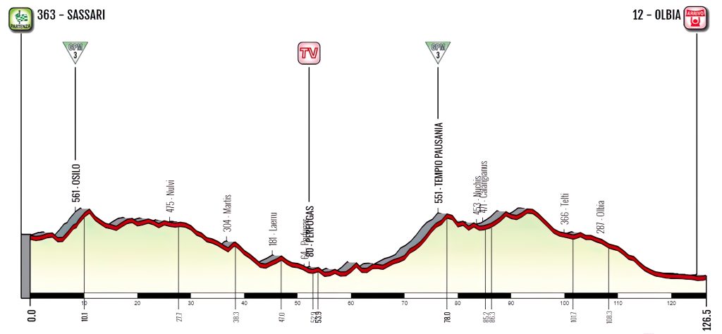 Na een dag zonder verplaatsing (het kan dus wel), volgt nog een laatste etappe. Er is gekozen om de snelste route tussen Sassari en de Sardijnse oostkust te nemen. Opnieuw valt er wel wat te klimmen. Wordt het dan nog een keer spannend? Tja, de klimmetjes naar Osilo (4,8 km à 5,2%) en Tempio Pausania (8,6 km à 4,4%) klinken op papier nog wel als mogelijkheden, maar wie weet waar op het parcours die beklimmingen zich bevinden, zal de hoop vermoedelijk laten varen.