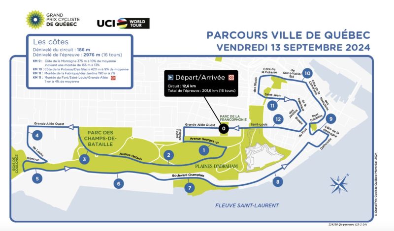 De GP de Québec houdt vast aan zijn beproefde recept, want het parcours van dit jaar is identiek aan dat van de voorbije drie edities. Dat betekent zestien rondes van 12,6 kilometers, goed voor een afstand van 201,6 kilometer met daarin bijna 3.000 hoogtemeters.