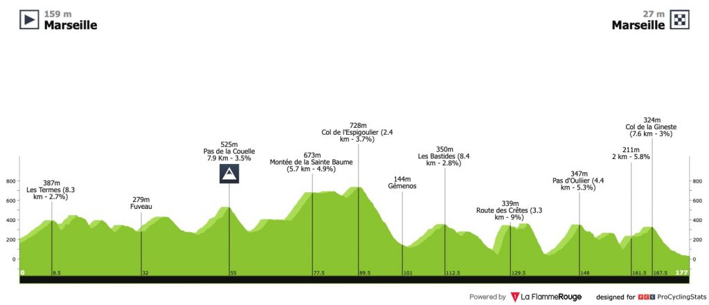 Het startschot van de GP La Marseillaise klinkt in de wijk Château-Gombert, even ten noorden van de kustplaats. Vervolgens leidt het parcours de renners meteen het heuvelachtige land in, weg van de Middellandse Zee. De eerste klim is die naar Les Thermes (8,3 km aan 2,7%) en daarna wordt het nauwelijks meer vlak. Na ruim vijftig kilometer passeren de renners de Pas de la Couelle (7,9 km aan 3,5%), gevolgd door de Montée de la Sainte Baume (5,7 km aan 4,9%) en de Col d’Espigoulier (2,4 km aan 3,7%).