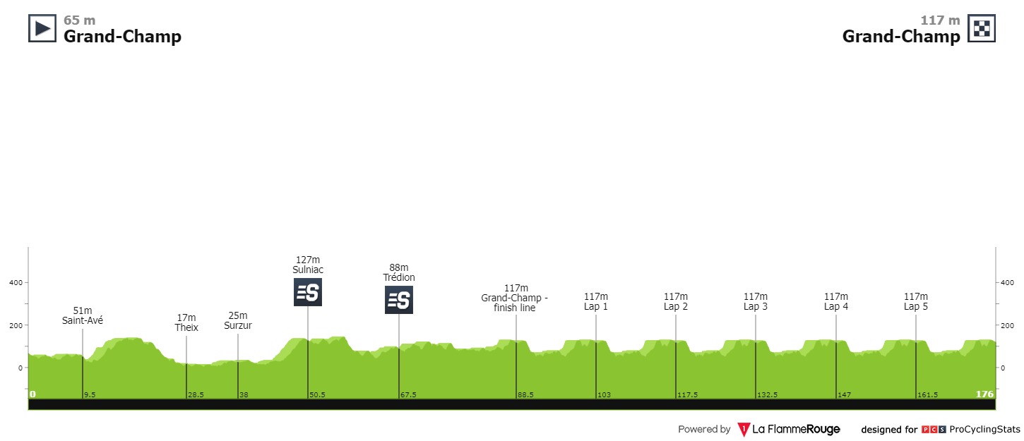 De renners trekken onder meer door Saint-Avé, Sulniac en Trédion richting Grand-Champ, waar ze na iets minder dan negentig kilometer een eerste keer de finish passeren. Vanaf dat moment is het rondjes draaien in en rond Grand-Champ. Onderweg staan er misschien geen gecategoriseerde heuvels op het menu, maar dat wil niet zeggen dat we een sprint krijgen tussen de snelle mannen. In de omgeving van Plumelec loopt de weg eigenlijk constant op en af.