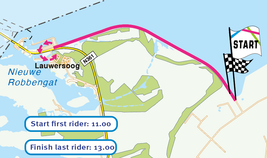 Het startpodium staat op de Kustweg, aan de kant van Midhuizen. Van hieruit is het 7,2 kilometer rijden langs de dijk naar het keerpunt. En keerpunt kunnen we letterlijk nemen, want het gaat over dezelfde Kustweg weer terug.