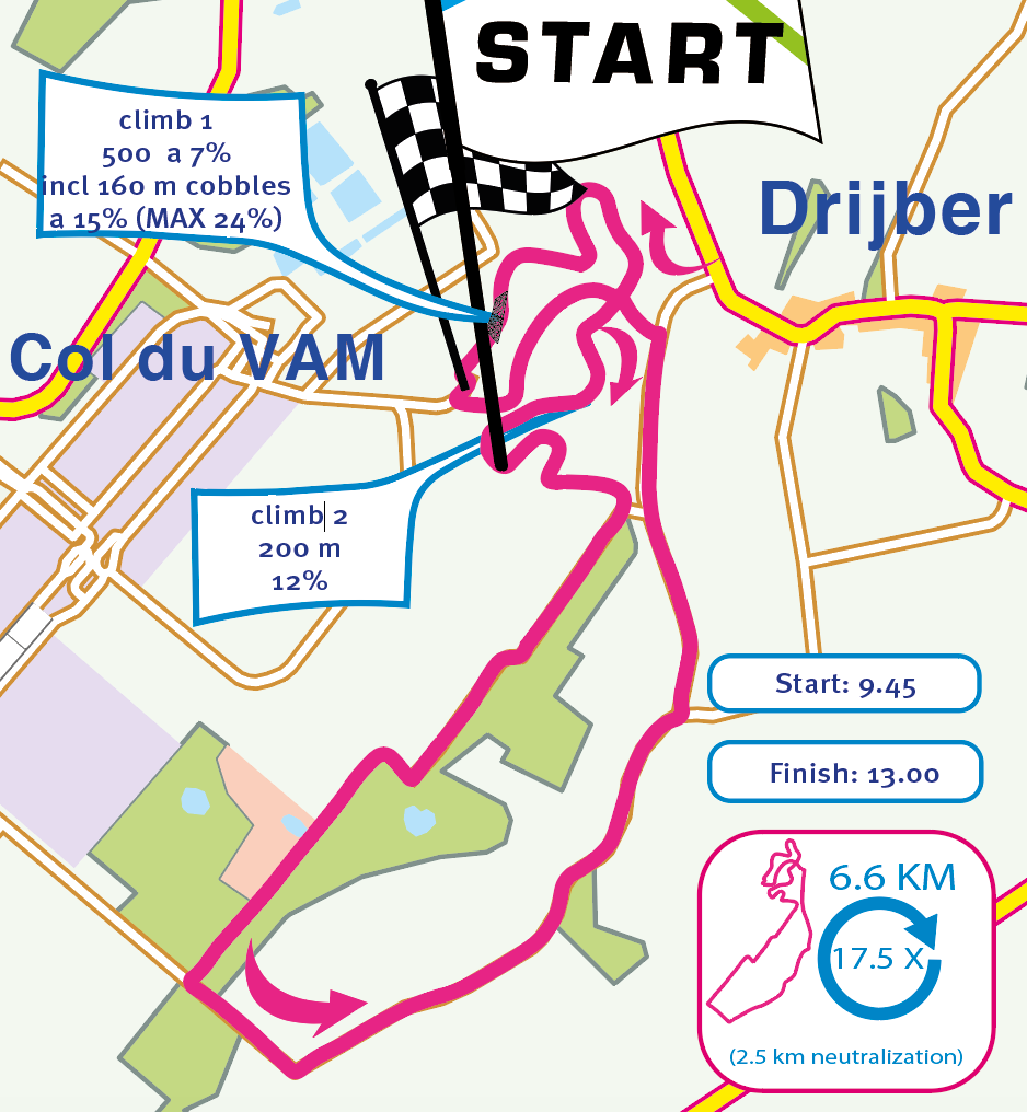 De rensters rijden in totaal 17,5 ronde over de omloop. Goed voor een koers over 115,1 kilometer, met daarin 36 venijnige klimmetjes. De VAM-berg kan op vier manieren worden beklommen. Je hebt de variant die al heel wat jaren voor de aanleg van het fietstracé werd gebruikt voor passages in de Ronde van Drenthe, maar deze weg fungeert nu als de afdaling direct na het voltooien van een ronde. De finish voorbijrijden betekent vrijwel direct een bocht naar links en snelheid maken.