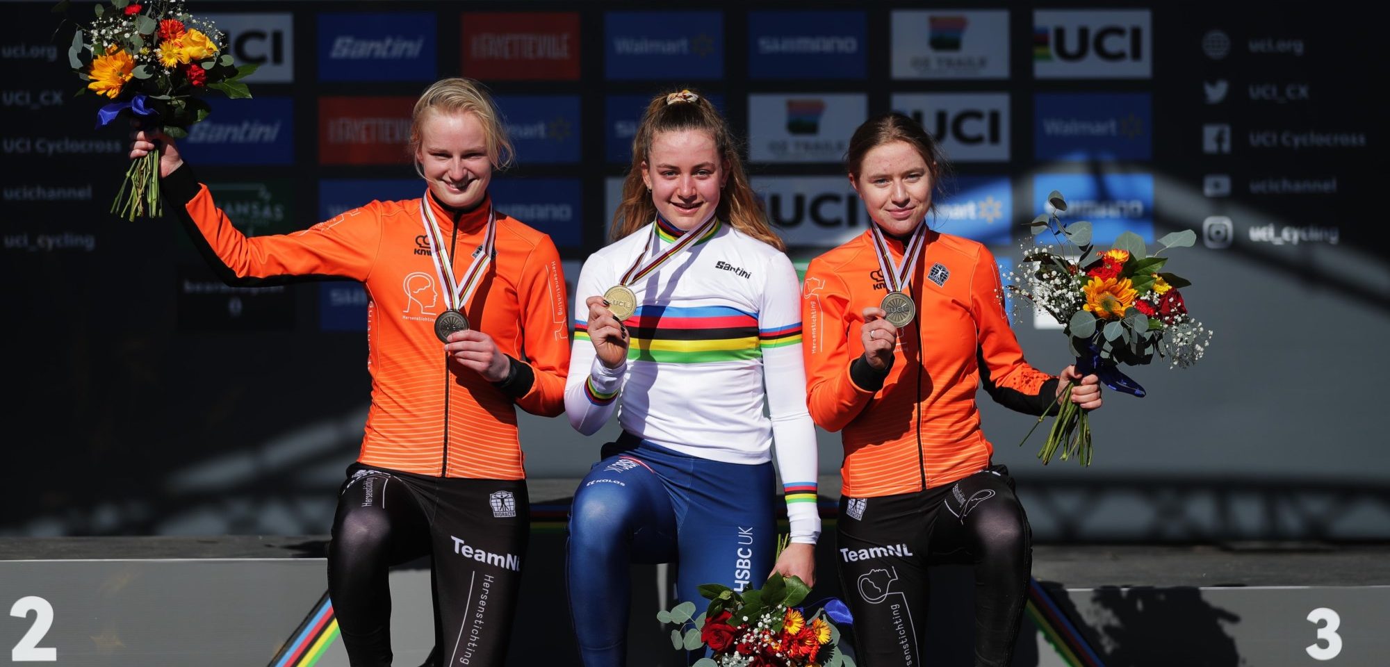 Bentveld (links) en Molengraaf flankeren wereldkampioene Zoë Bäckstedt op het jongste WK voor junioren – foto: Cor Vos