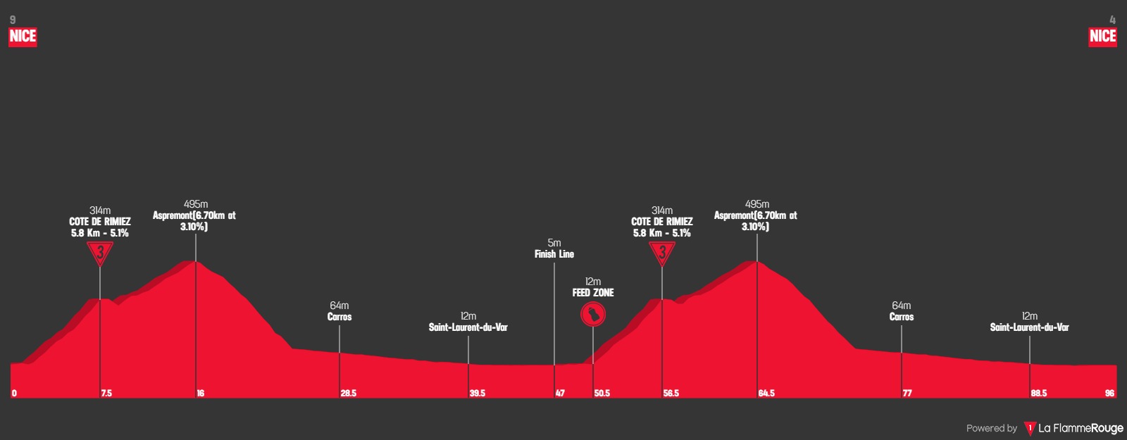 Rond een uur of tien klinkt aan de Middellandse zeekust het startschot voor La Course by Le Tour de France avec FDJ, zoals de wedstrijd voluit heet. Het is zaak om voor de start al op de rollen te rijden, want het gaat zeer snel na de start al bergop. De Côte de Rimiez (5,8 km à 5,1%) is de enige gecategoriseerde klim op het parcours, maar ze wordt na een zeer korte afdaling gevolgd door de klim naar Aspremont (6,7 km à 3,1%), waardoor we de facto kunnen spreken van een tweetrapsraket.