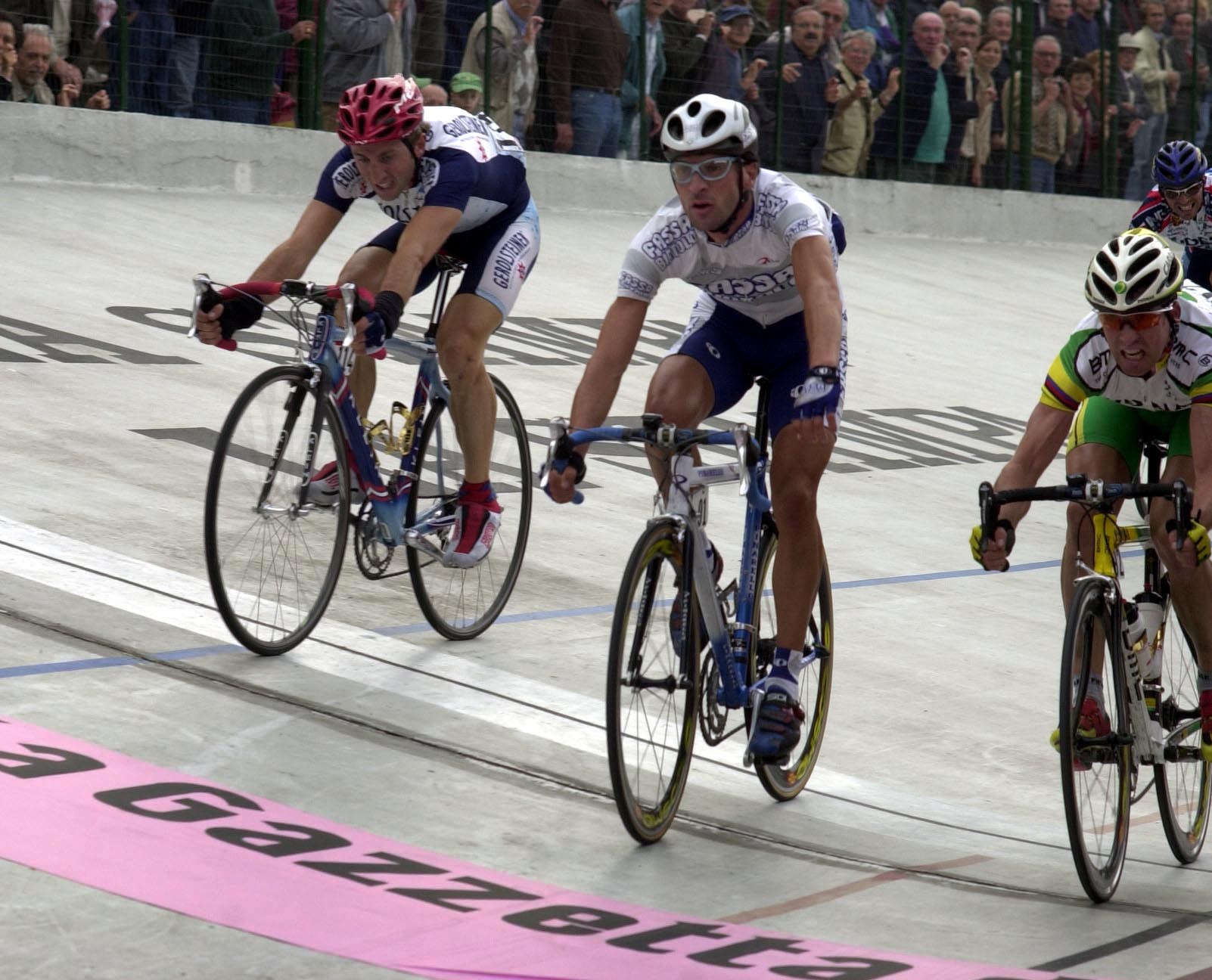 Bartoli wint in 2002, voor Oscar Camenzind (rechts), Davide Rebellin (links) werd vierde – foto: Cor Vos
