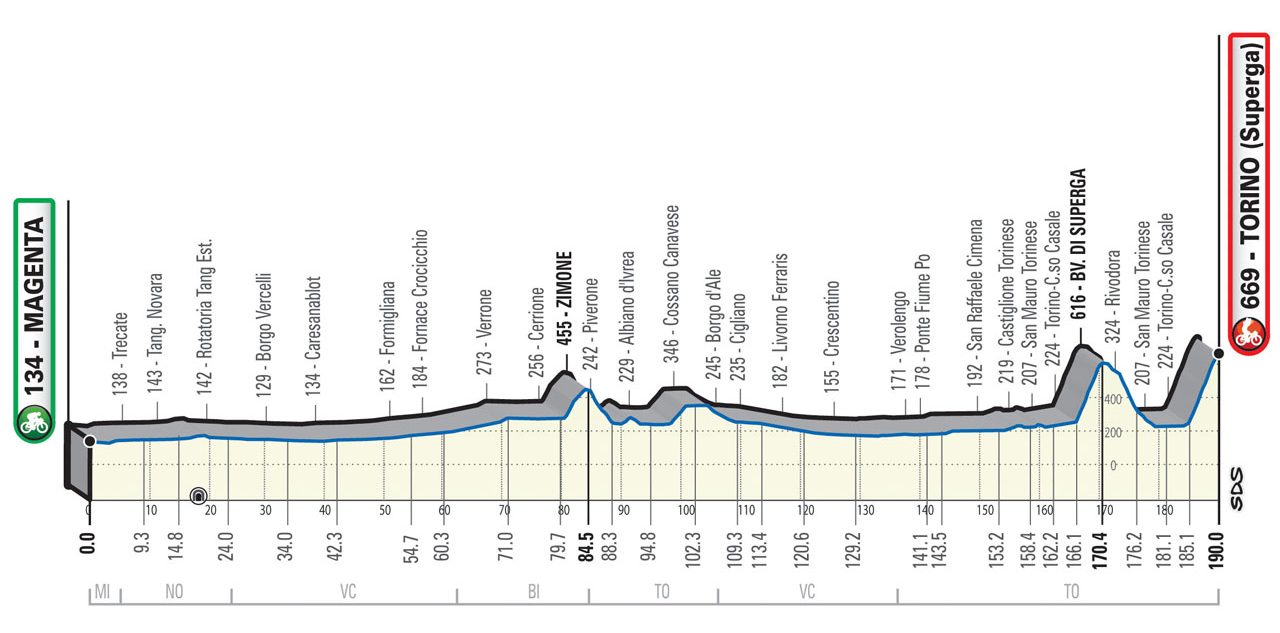 De laatste zestig kilometer gaat dan weer over bekende wegen. In de richting van Turijn kijken de renners aan de linkerzijde op de heuvels van Monferrato, terwijl ze aan de noordwestzijde de besneeuwde toppen van de Alpen zien liggen. Het gaat over lange, rechte en mooie wegen naar Turijn. De stad binnenrijden doen ze niet echt. Vlak daarvoor buigen ze namelijk terug af naar de heuvels, om koers te zetten naar de Basiliek van Superga. Deze bezienswaardigheid is gelegen op de gelijknamige heuvel op 672 meter boven zeeniveau. Naast de basiliek is Superga ook bekend van een desastreuze vliegramp in 1949.