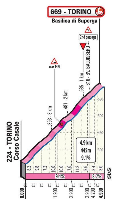 Om de klim te eren, rijden de renners in de finale twee keer de Superga op. De klim kenmerkt zich vooral door het constante hoge stijgingspercentage. Over een afstand van 4,3 kilometer is de gemiddelde stijging 9%, met halverwege een strook van 14%. De basiliek laten de renners na de eerste aankomst letterlijk links liggen, voordat ze de afzink ingaan en via dezelfde weg terugkeren aan de voet van de Superga. Ze kennen de klim dus goed, maar bij de laatste passage slaan de renners wél linksaf naar de basiliek, om helemaal door te rijden naar boven. In de laatste 600 meter stijgt de weg daardoor nog maar een keertje.