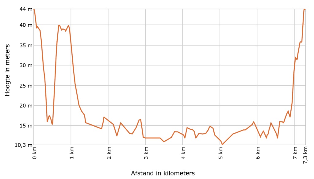 Laten we het parcours eens van dichterbij bekijken. Het 7,3 kilometer lange rondje begint voor het informatiecentrum De Blinkerd, een soort vliegende schotel boven op de berg. Daar is informatie te vinden over het Oude Diep-project en de VAM-berg. Van daaruit loopt de route eerst naar beneden via het Ronde van Drenthepad. Bij de viersprong wordt het Mount Vampad opgereden, de eerste klim van 200 meter.