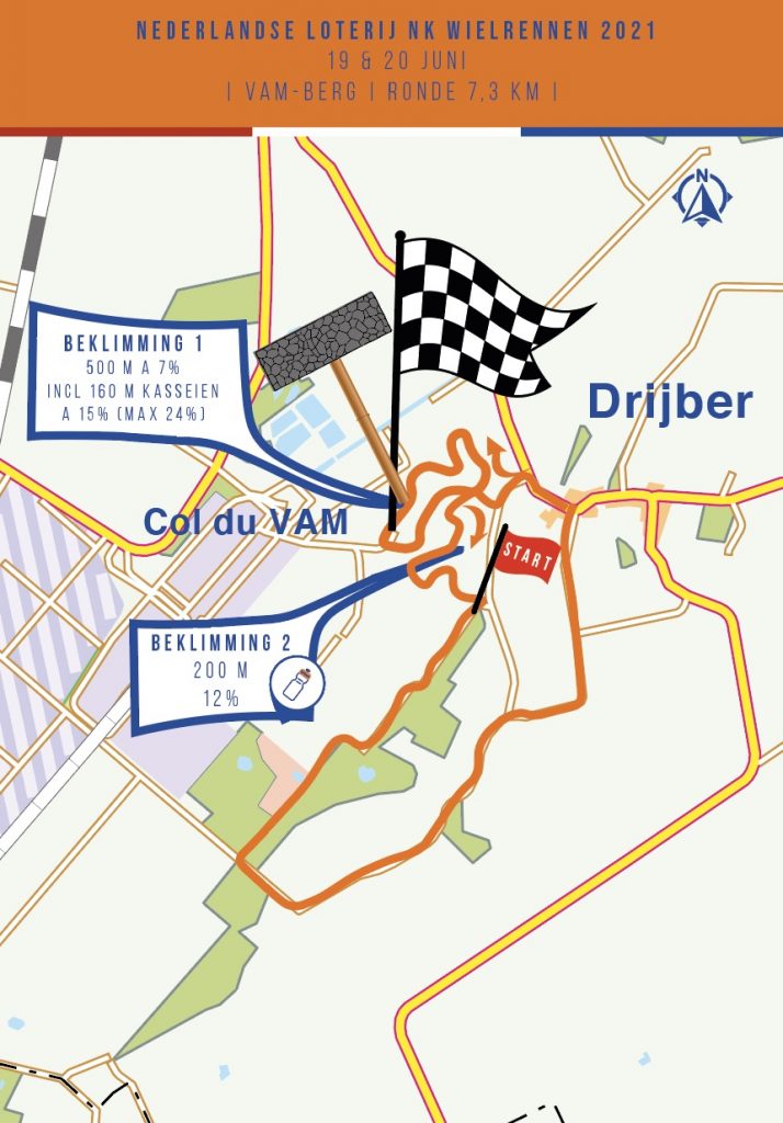 Het parcours van het NK wielrennen is vrijwel identiek aan vorig jaar: een lokale omloop van 7,3 kilometer op en rond de VAM-berg, die 27 keer moet worden afgelegd. Elke ronde wordt de ‘Col du VAM’ van twee kanten omhoog gereden. Eerst een klim van 200 meter aan 12 procent, na de passage door het dorp Drijber een gedeeltelijke kasseiklim van 500 meter (gemiddelde stijging 7%, maximaal 24%) naar de finishstreep.