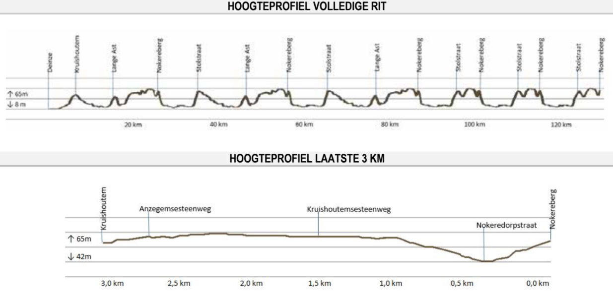 In de ronde van 12 kilometer zijn de Herlegemstraat en Nokereberg de hindernissen. De met kasseien geplaveide finishhelling is 350 meter klimmen aan 5,7%, met een maximum stijgingspercentage van 7%. Goed te doen voor iedere duurbetaalde wielerprof, maar het is wel een listige aankomst.