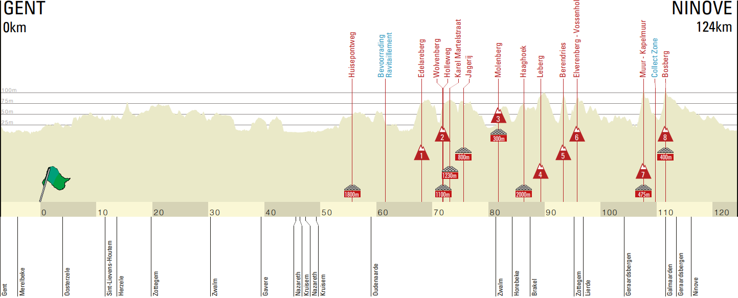 Na het Vossenhol hebben de rensters er zo’n 96 kilometer opzitten. Na deze helling is het eventjes wachten op de laatste twee obstakels, de Muur van Geraardsbergen en de Bosberg. Dit welbekende, met kasseien geplaveide slotduo, vormt nog een mooie gelegenheid om verschillen te maken. Na de Bosberg is het een goede twaalf kilometer doorjassen tot de finish op de Onderwijslaan in Ninove. Na de laatste helling zullen er absoluut verschillen zijn gemaakt, de vraag is alleen hoe groot de gaten zullen zijn.