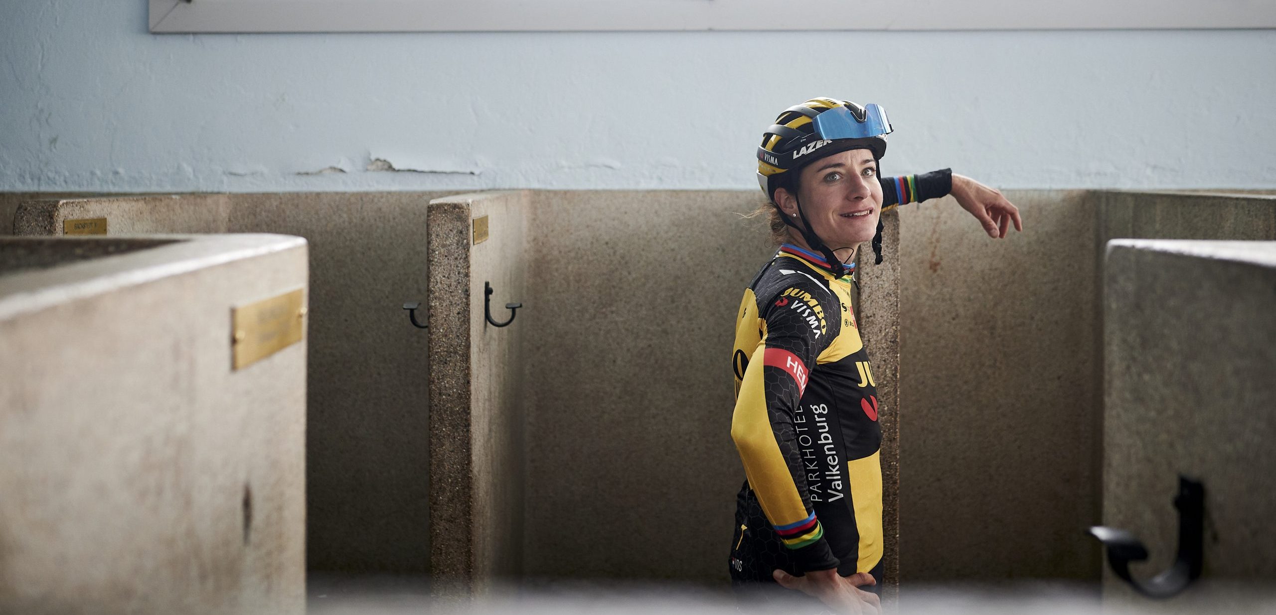 Vos ging na de verkenning kijken bij de historische douches – foto: Bram Berkien/Jumbo-Visma
