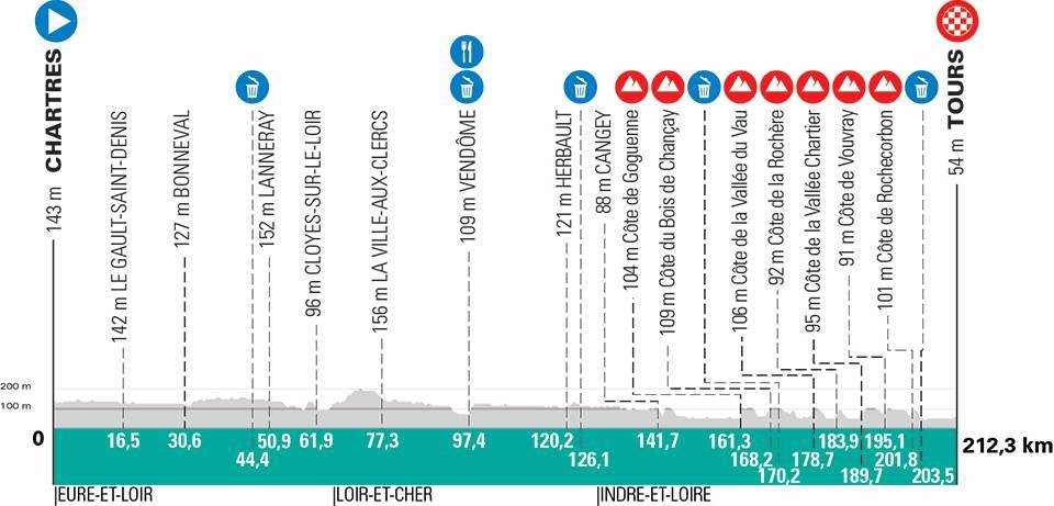 Met nog zeventien kilometer op de koersteller is het tijd voor de behoorlijk lange Côte de Vouvray, met aansluitend het onverharde strookje van Rochecorbon op veertien kilometer van het einde en de Côte de Rochecorbon (500 meter lang) op tien kilometer voor de finish. Daarna is het grotendeels rechtdoor richting de laatste chicane op slechts één kilometer van de meet. Op de brede Avenue de Grammont ligt dan eindelijk die verlossende eindstreep.