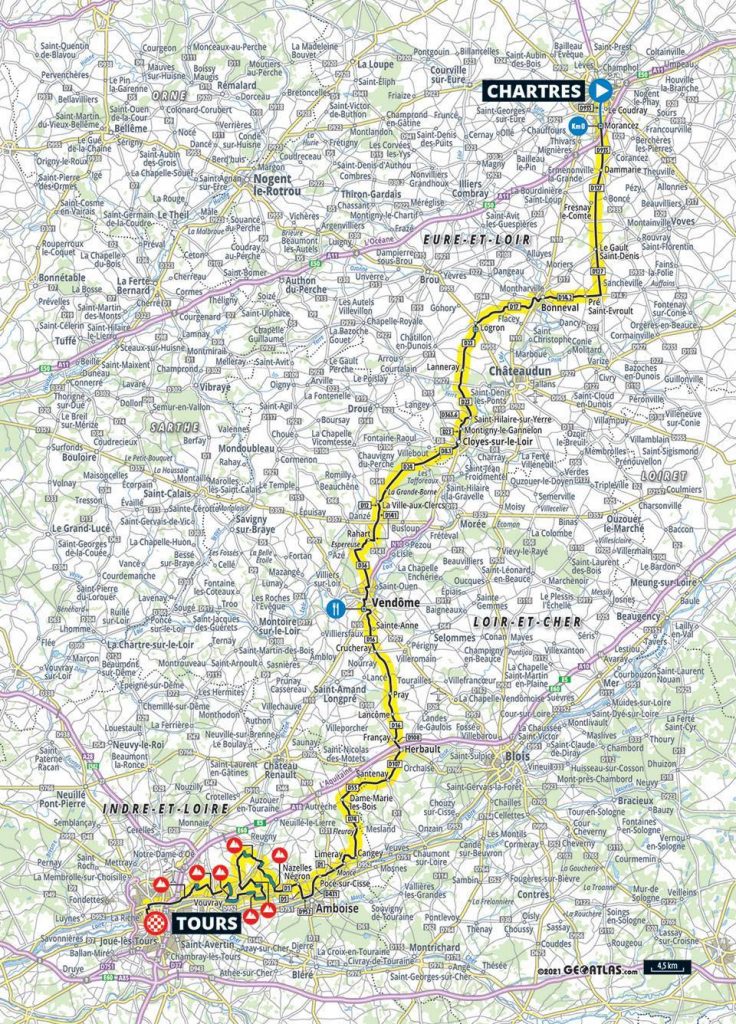 Voor de start van Parijs-Tours verzamelen de renners zich in… Chartres. De klassieker vertrekt trouwens al lang niet meer vanuit Parijs zelf. Saint-Arnoult-en-Yvelines – een plaatsje tussen Parijs en Orléans – was jarenlang de plek waar het allemaal begon. Zo’n tien jaar geleden besloot de organisatie de start te verplaatsen naar het veel grotere Chartres, dat kan pronken met een historische binnenstad en natuurlijk een van de bekendste kathedralen van Frankrijk.