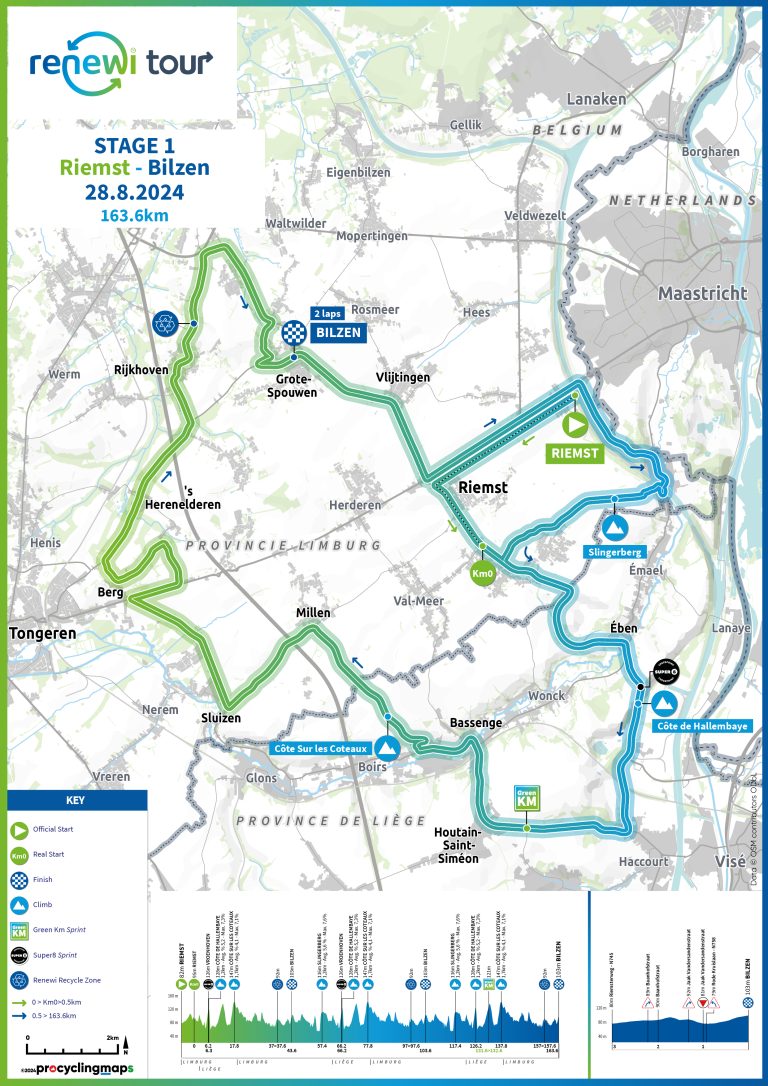 De eerste etappe van de Renewi Tour speelt zich af in het noordoosten van België, in de provincie Limburg. De renners verzamelen zich in Riemst, een plaats met iets minder dan 20.000 inwoners. Het is een plek die onlosmakelijk verbonden is met de fietsende broers Yvo en Roger Molenaers. Van daaruit gaat het naar de bekende stad Bilzen, dat op de grens ligt van de Limburgse Kempen en Haspengouw.
