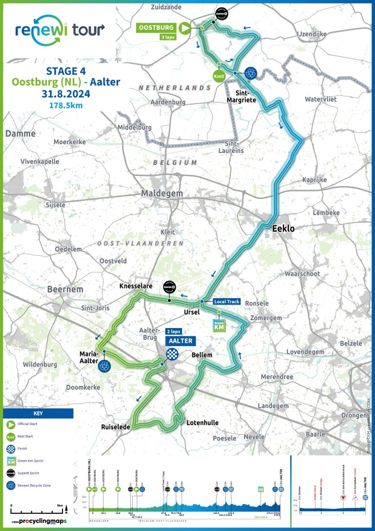 De snelle mannen zullen de etappes van vrijdag en zaterdag omcirkelen in hun routeboek, want ook rit vier zal normaal eindigen in een sprint. Voor de vierde etappe trekt de Renewi Tour eindelijk eens over de grens, om te starten in het Nederlandse Oostburg, provincie Zeeland. Van daaruit trekken de renners – na een lokale ronde – in zuidelijke richting weer naar België. Om na 178,5 kilometer te finishen in Aalter.