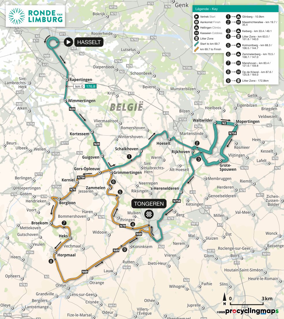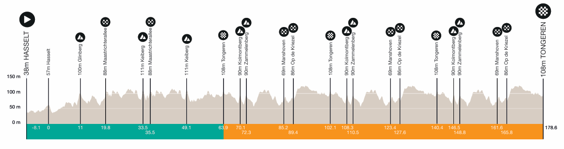 Waar de organisatie vorig jaar nog dichtbij de 200 kilometers-grens aanleunde, kiest men nu voor amper 176 kilometer koers. Via de Glinberg (1 km aan 4,7%), de Keiberg (600 meter aan 4,7%, twee keer) en twee keer de Maastrichterallee (700 meter aan 4,2%), worden de renners op een rondje Limburg getrakteerd, alvorens ze na zo’n zeventig kilometer koers voor het eerst in finishplaats Tongeren toekomen.