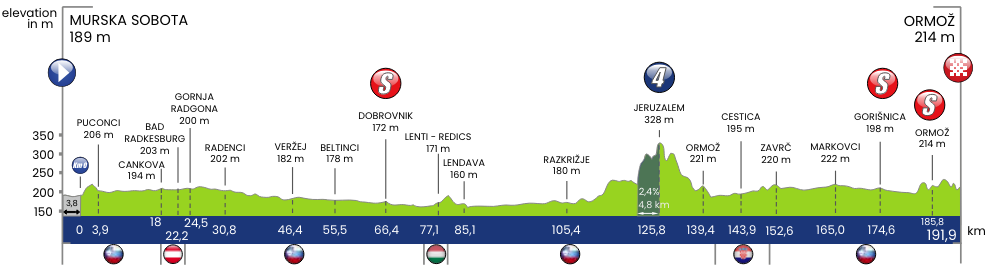 De start van de eerste etappe vindt plaats in Murska Sobota en leidt de renners door de drie buurlanden, Oostenrijk, Hongarije en Kroatië. Een unieke ervaring voor het peloton dus. Het parcours van de eerste etappe is niet veeleisend met slechts één beklimming van de vierde categorie. De eerste leider zal in Ormož dus hoogstwaarschijnlijk beslist worden in een massasprint. Kan Dylan Groenewegen zijn kunstje van vorig jaar herhalen?
