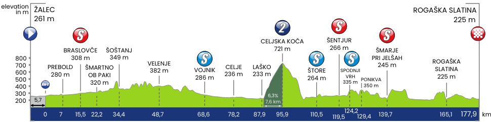 De route van de tweede rit kent ook weinig échte obstakels. Voor het technische laatste deel van de etappe moeten de deelnemers namelijk enkel van Laško naar Celjska Koča (7,6 km à 6,3%) klimmen. Hoewel er nog een lange weg te gaan is van de top naar de finish in Rogaška Slatina, zou de klim een aanzienlijke impact kunnen hebben op de uitslag van de etappe. We kunnen veel aanvallen verwachten. Historisch gezien werd de strijd in Rogaška Slatina echter altijd beslist door een sprint van het peloton.