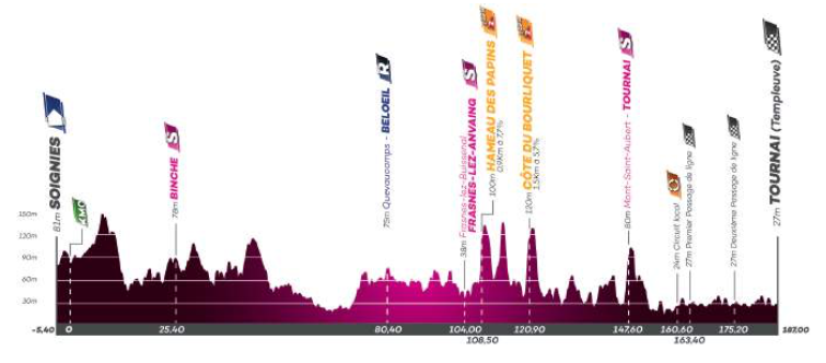 Het lijkt een kans voor de sprinters, aangezien de enige twee heuvels (Hameau des Papins en Côte du Bourliquet) halverwege de etappe liggen. Vanaf dan is het nog ruim vijftig kilometer tot de eindstreep. De finale is flink rechttoe, rechtaan. De laatste 2,5 kilometer in Templeuve zijn zonder bochten.