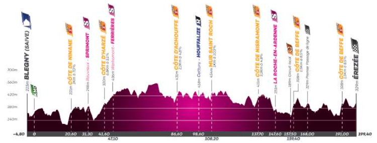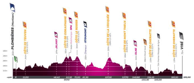 Onderweg liggen liefst zeven beklimmingen, waarvan vier in de laatste honderd kilometer. De Côte de Teuven, de Côte de Cokaifagne en de Côte de Rosier staan vroeg in de rit op het programma. De finale begint met de Côte de la Vacquée, gevolgd door de Côte de Mont Theux. In de laatste 40 kilometer volgen dan nog twee beklimmingen van de Côte de Cheratte, die onderdeel is van een lokaal parcours.