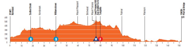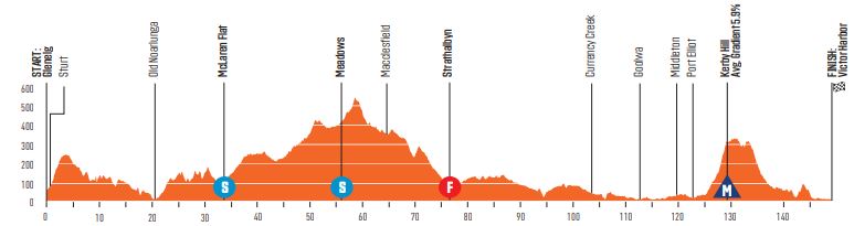 Het gaat via Aldinga naar de plaatselijke ronde met als scherprechter Willunga Hill, die de renners tweemaal zullen beklimmen. Na de eerste passage is het nog ruim twintig kilometer te gaan, maar na de laatste keer Willunga Hill zal er ook meteen worden gefinisht. Sinds 2014 is Richie Porte er onverslaanbaar, maar het leverde de Tasmaniër slechts één keer de eindzege op. Meestal komt hij een paar seconden tekort voor de leiderstrui, is dat ook dit jaar het geval?
