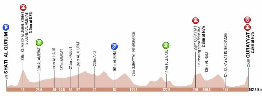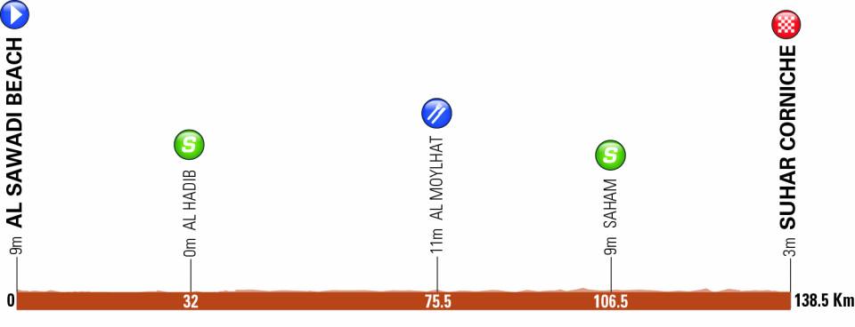 De renners kunnen er zaterdag eventjes lekker inkomen en acclimatiseren aan de weersomstandigheden in de woestijnstaat. In een etappe over 138,5 kilometer gaat het van Al Sawadi Beach naar Suhar Corniche. Dat ligt in het noorden van Oman. Een ellenlange rechte weg kenmerkt de route, die pal langs de kust van de Golf van Oman trekt. De rit kent amper hoogtemeters en is nagenoeg volledig vlak. De enige noemenswaardigheden zijn de tussensprints, die volgen na 32 en 106,5 kilometer. De laatste duizend meter zijn volledig vlak, waardoor een koninklijke massasprint onvermijdelijk lijkt.