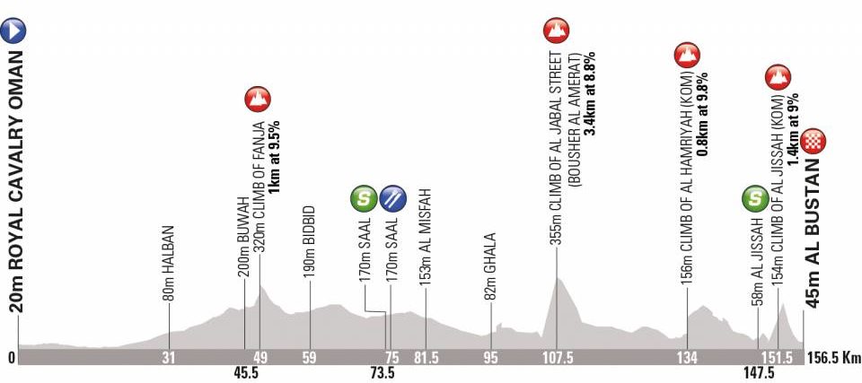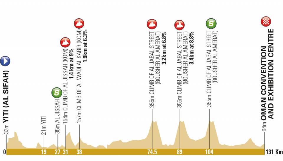 Daags na de langste rit in Oman, volgt meteen de kortste etappe. Van Yiti naar het Oman Convention & Exhibition Centre is ze ‘slechts’ 131 kilometer lang. In principe trekt het peloton terug naar hetzelfde gebied waar ze een dag eerder start. Zo komen de renners na 31 kilometer de klim naar Al Jissah uit de tweede rit tegen. Via de hoofdstad Mascat komen ze net na halfweg koers opnieuw aan bij de Al Jabal Street.