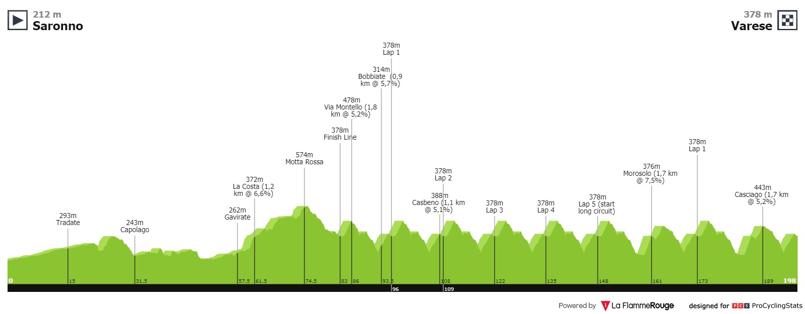Zeker weten doen we het natuurlijk niet, maar de beslissing zal waarschijnlijk vallen in het laatste koersuur, als er twee grotere lokale rondes van 25 kilometer op het programma staan. Het begint allemaal met de Via Montello (1,8 km aan 5,2%), gevolgd door een snelle afdaling en de beklimmingen naar de plaatsjes Morosolo (1,7 km aan 7,5%, maar met pieken tot 10%) en Casciago (1,7 km aan 5,2%).