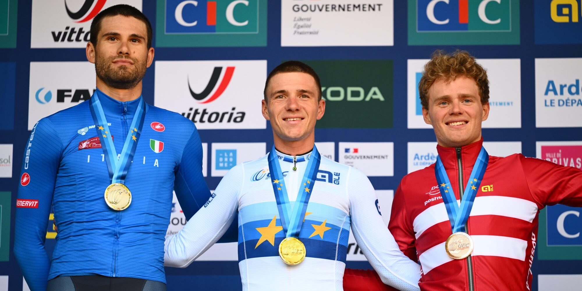 Larsen (rechts) naast Evenepoel en Ganna – foto: Cor Vos
