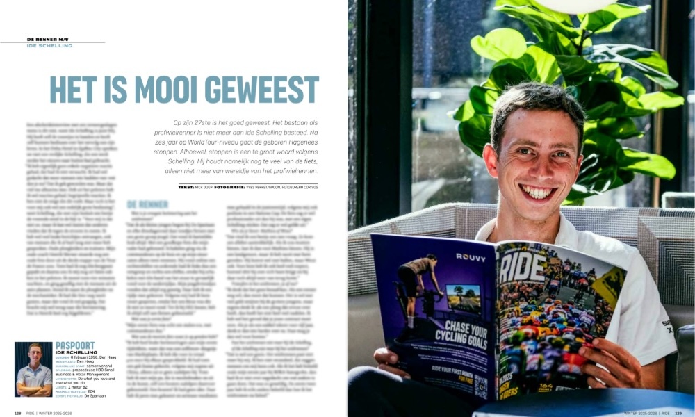 De RIDE Magazine Wintergids 2025 zit met 156 pagina's bomvol mooie wielerverhalen. Een van de interviews is met de afzwaaiende Ide Schelling, die besloten heeft om vroeg in zijn carrière al te stoppen met wielrennen. Waarom? En hoe moeten we hem ons herinneren? In de Wintergids lees je ook verhalen met Lorena Wiebes, Tibor Del Grosso, Oscar Onley, Wilco Kelderman en over de crosswinter en Alpe d'Huez.