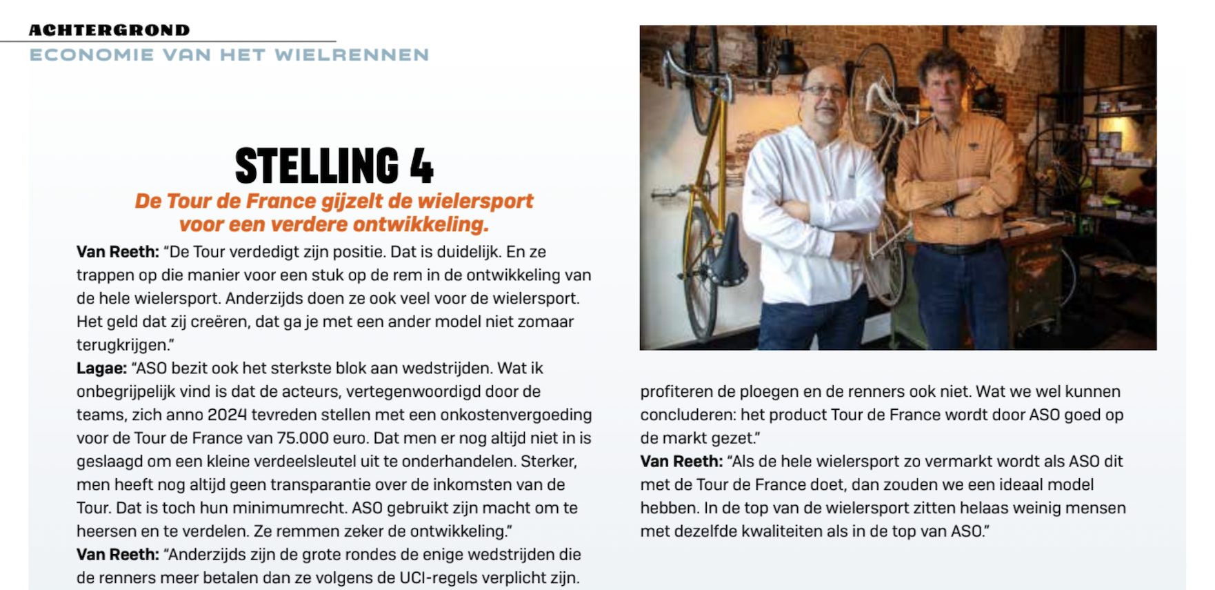 In de nieuwe RIDE Magazine (€9,95) lees je een uitgebreid interview over een vaak onderbelichte kant van de koers. Daam Van Reeth en Wim Lagae analyseren al jarenlang de economische staat van het wielrennen. RIDE Magazine legde hen zeven stellingen voor. Wil je het hele verhaal met talrijke interessante invalshoeken lezen? dan kun je RIDE Magazine bestellen. Bestel jouw exemplaar van het voorjaarsnummer 2024 van RIDE Magazine (188 pagina’s) hier!