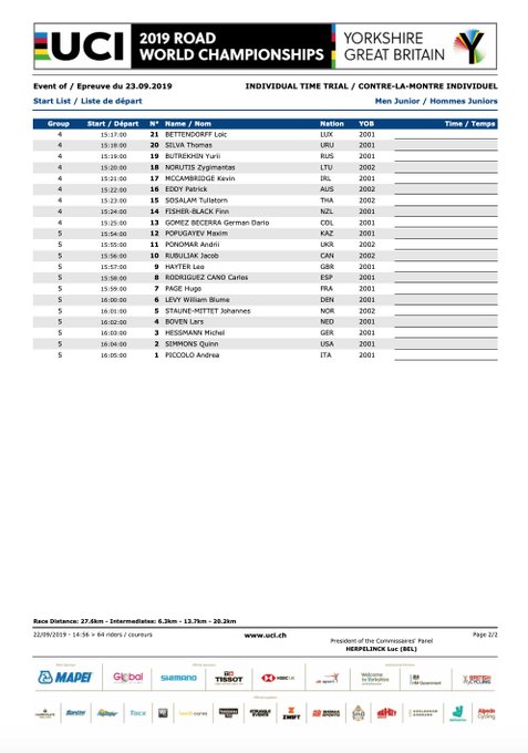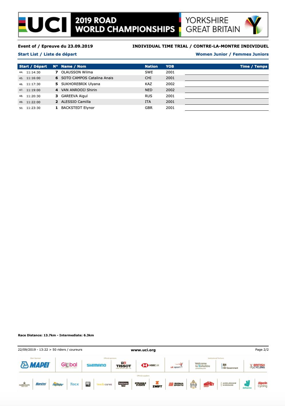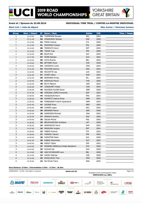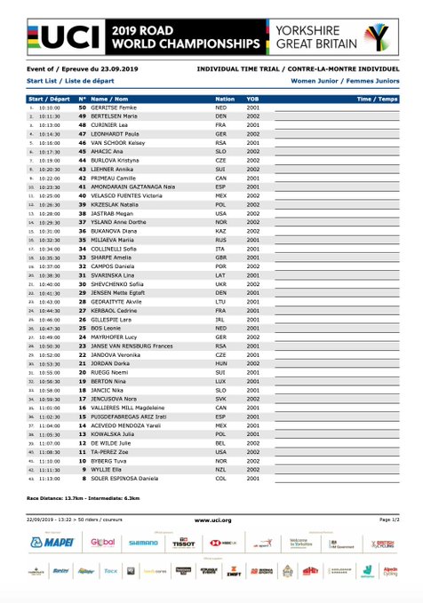 WK 2019: Starttijden tijdrit junioren mannen en vrouwen