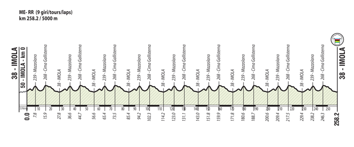 Het WK wordt verreden op en rond het autocircuit Autodromo Enzo e Dino Ferrari, waar jaarlijks de Formule-1 GP van San Marino werd gehouden. Direct na het verlaten van het circuit moet er al geklommen worden. Onderweg zijn er twee beklimmingen die er toe doen: de Mazzolano en de Cima Gallisterna. Beide beklimmingen zijn niet bijzonder lang maar met maximale stijgingen van 13 en 14 procent gaan deze klimkilometers naarmate de wedstrijd vordert, door de renners gevoeld worden.