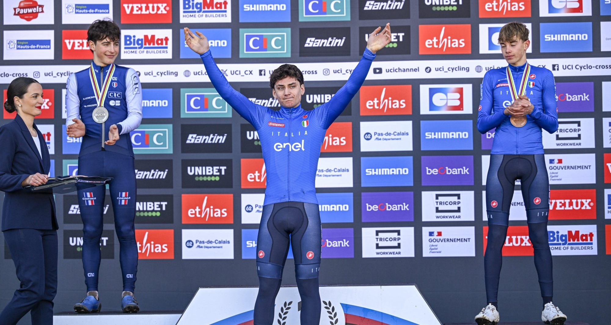 Mattia Agostinacchio is de nieuwe wereldkampioen veldrijden bij de junioren mannen. De 17-jarige Italiaan kwam na een knotsgekke wedstrijd – vol memorabele momenten, schuivers en valpartijen – als eerste over de streep in Liévin. Thuisfavoriet Soren Bruyère Joumard werd tweede, Filippo Grigolini (derde) maakte het Italiaanse feestje compleet.