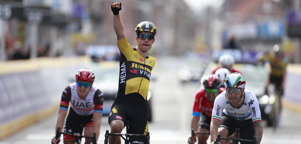 Gent-Wevelgem 2021 is gewonnen door Wout van Aert. De kopman van Jumbo-Visma was na bijna 250 kilometer koers als eerste aan de finish in Wevelgem. Hij won de sprint van een kopgroep van zeven na een straffe waaiereditie, na goed voorbereidend werk van ploegmaat Nathan Van Hooydonck. Giacomo Nizzolo werd tweede, Matteo Trentin derde.