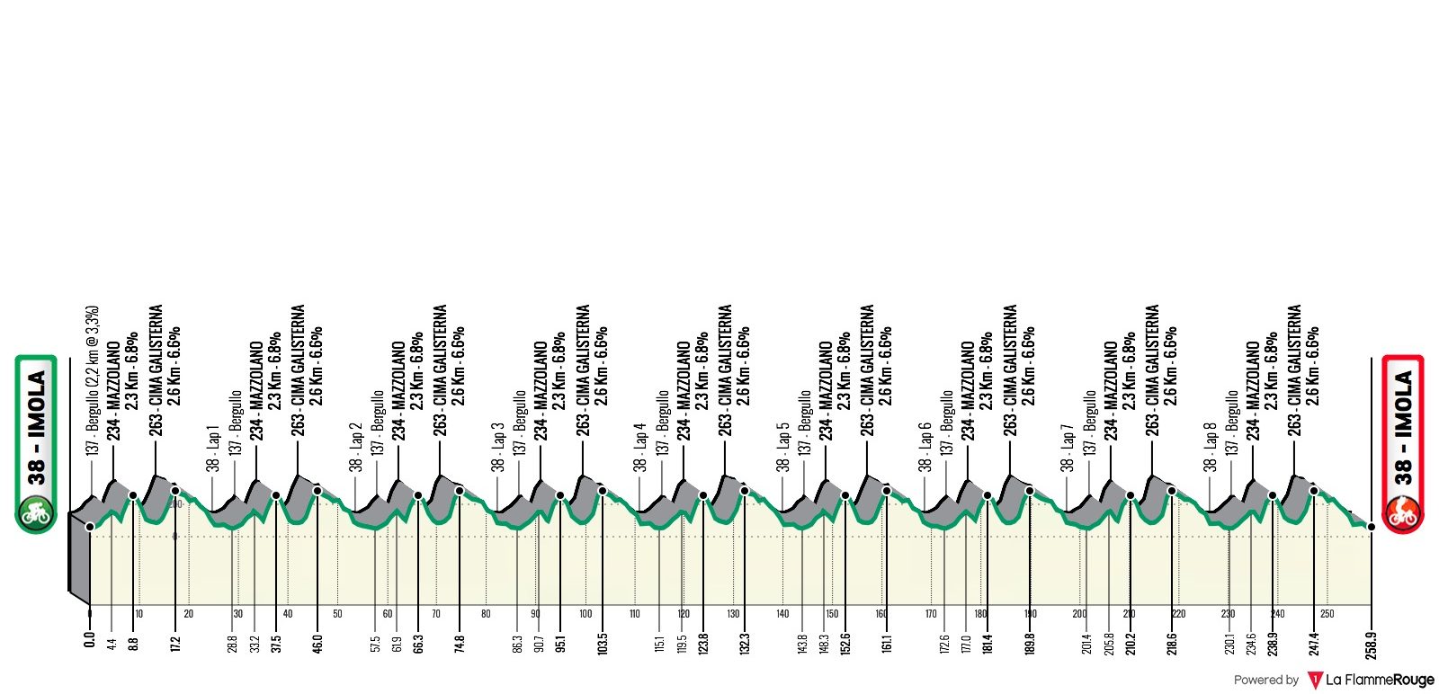 De beklimming van de Galisterna heeft een stuk van 1.4 kilometer boven de 10%, dat is dus vergelijkbaar aan de muur van Huy. En dat mogen ze vervolgens negen maal doen. Door de finish na een afdaling zal er een select favorietengroepje (3, 4 of 5 renners) sprinten voor het goud.