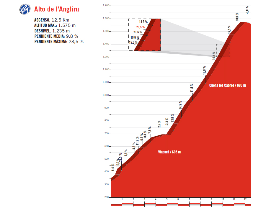 De ruim zestien kilometer lange beklimming – aan iets meer dan 6% – maakte in 2011 zijn debuut in La Vuelta. De zege ging toen, vanuit een vlucht, naar de Est Rein Taaramäe. Ook Alberto Contador (2014) en David Gaudu (2020) mochten er al hun handen in de lucht steken. Of de Vuelta ook volgend jaar de klim vanuit La Riera zal oprijden, is maar de vraag. Tegenwoordig zijn beide kanten van La Farrapona namelijk geasfalteerd.