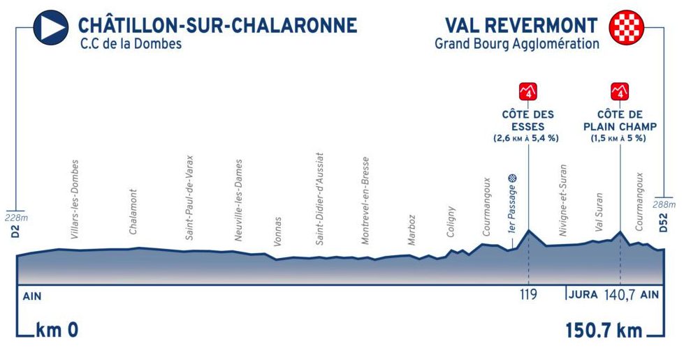 Na de top van de Côte de Plain Champ is het nog tien kilometer tot de streep in Val Revermont. Een sprint lijkt het meest waarschijnlijke scenario, al zullen de punchers dit profiel ook graag zien. Onder meer Julian Alaphilippe, Guillaume Martin, Tim Wellens en Jesús Herrada staan aan de start. Een andere opvallende naam is Thibau Nys, die voor het eerst in actie komt voor Trek-Segafredo.
