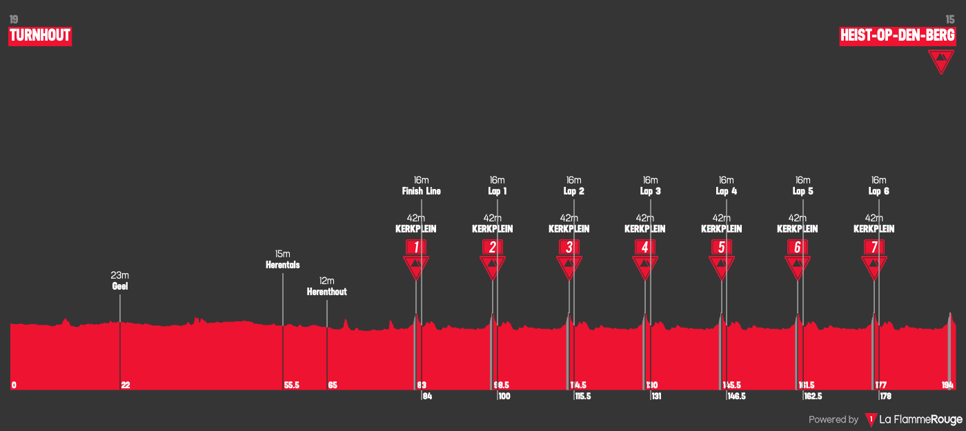 Opnieuw is de wedstrijd 194 kilometer lang. De koers begint met een aanloop van 84,8 kilometer vanaf de Grote Markt in Turnhout. Daarna volgen nog zeven plaatselijke rondes in Heist-op-den-Berg van 15,6 kilometer. Vooral de laatste drie kilometer van elke lokale ronde is interessant, want daar ligt de Heistse Berg (0,6 km aan 5%). Deze boezemt de sprinters niet veel angst in, maar is voor puncheurs en aanvallers wel de uitgelezen plek om een aanval te plaatsen.