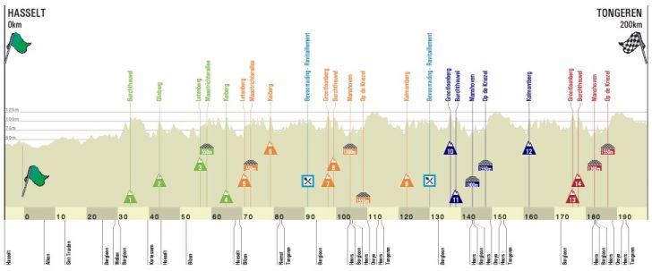 Vanuit Hasselt gaat het via Alken en Sint-Truiden naar de eerste klim van de dag. De Burchtheuvel wordt in totaal vier keer aangedaan en is behalve de eerste klim, ook de laatste horde op de route. Ook gaan de renners de Glinberg, Leteberg, Keiberg en Grootloonberg verschillende keren over. Tevens zijn de kasseistroken de Maastrichterallee, Manshoven en op de Kriezel opgenomen in het parcours. Na 200 kilometer ligt de streep in Tongeren.