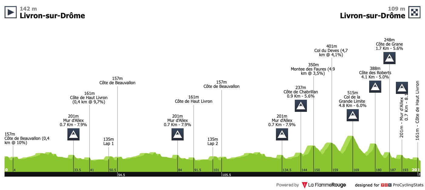 De wedstrijd begint én eindigt in Livron-sur-Drôme, na een koers van maar liefst 214,8 kilometer. Onderweg moeten de renners de nodige hoogtemeters overwinnen. Vooral de laatste zestig kilometer zijn zwaar, met onder meer de Col du Deves (4,7 km aan 4,1%), de Col de la Grande Limite (4,8 km aan 6%) en de Côte de Grane (1,7 km aan 5,6%).