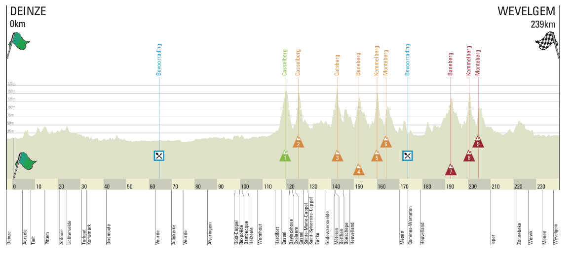 Om 11.25 uur is de officiële start in Deinze, de aankomst in Wevelgem wordt verwacht tussen 16.51 uur en 17.24 uur. Sporza op Één zal vanaf 14.20 uur live verslag doen van de klassieker.